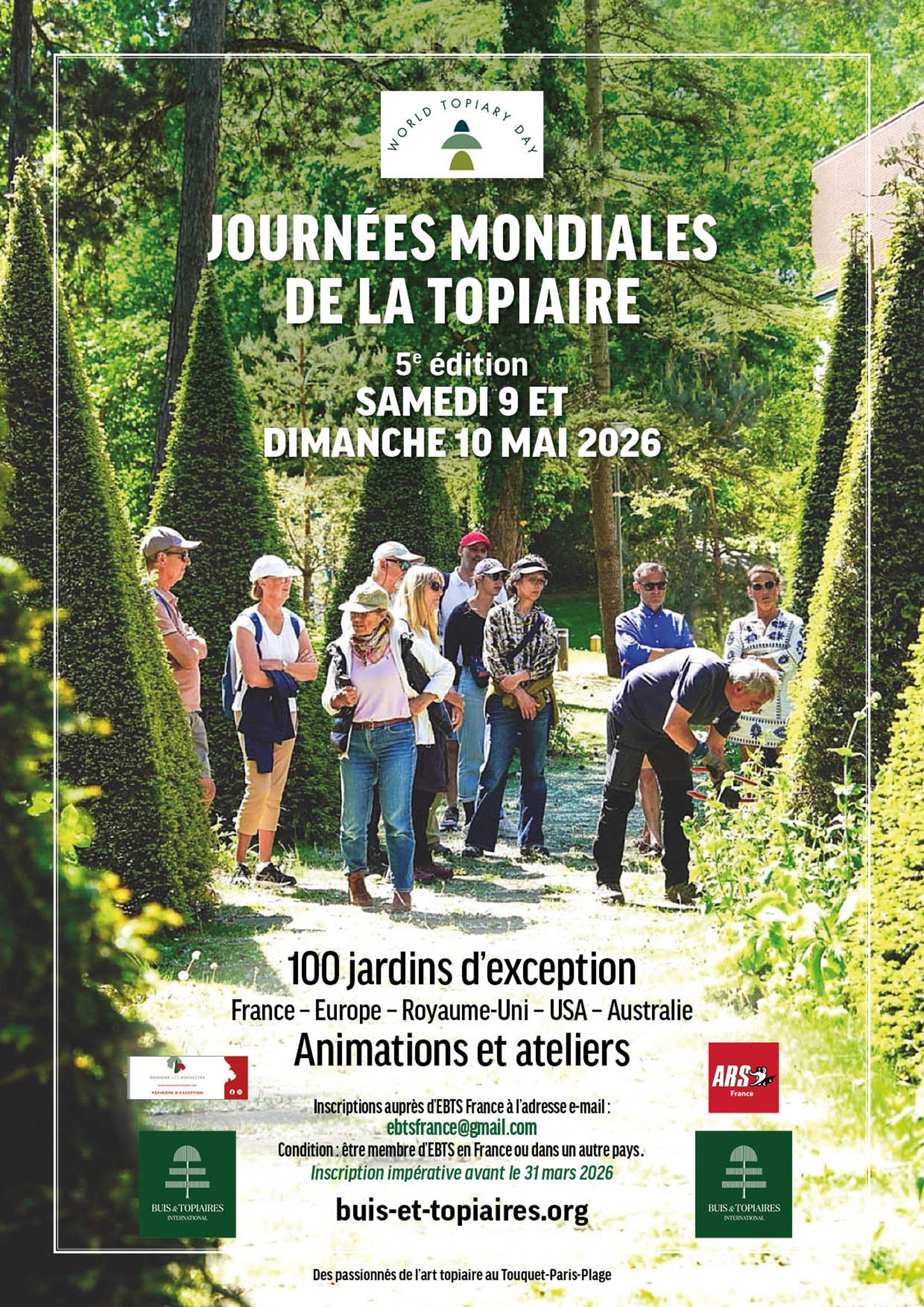 Les inscriptions aux Journées Mondiales de la Topiaire 2026 sont ouvertes! 25 octobre 2025 Art Topiaire Association Événements Infos Membres International WTD Les inscriptions aux Journées Mondiales de la Topiaire (World Topiary Days) 2026 sont ouvertes! 5e édition des Journées Mondiales de la Topiaire Samedi 9 et Dimanche 10 mai 2026 Inscriptions auprès d’EBTS France à l’adresse e-mail: ebtsfrance@gmail.com Condition: être membre d’EBTS, en France ou dans un autre pays. INSCRIPTION IMPÉRATIVE AVANT LE 31 MARS 2026. À ce sujet : Journées Mondiales de la Topiaire | Pages Documents : Voir le Pdf de présentation Télécharger le Bulletin d’inscription (.docx)