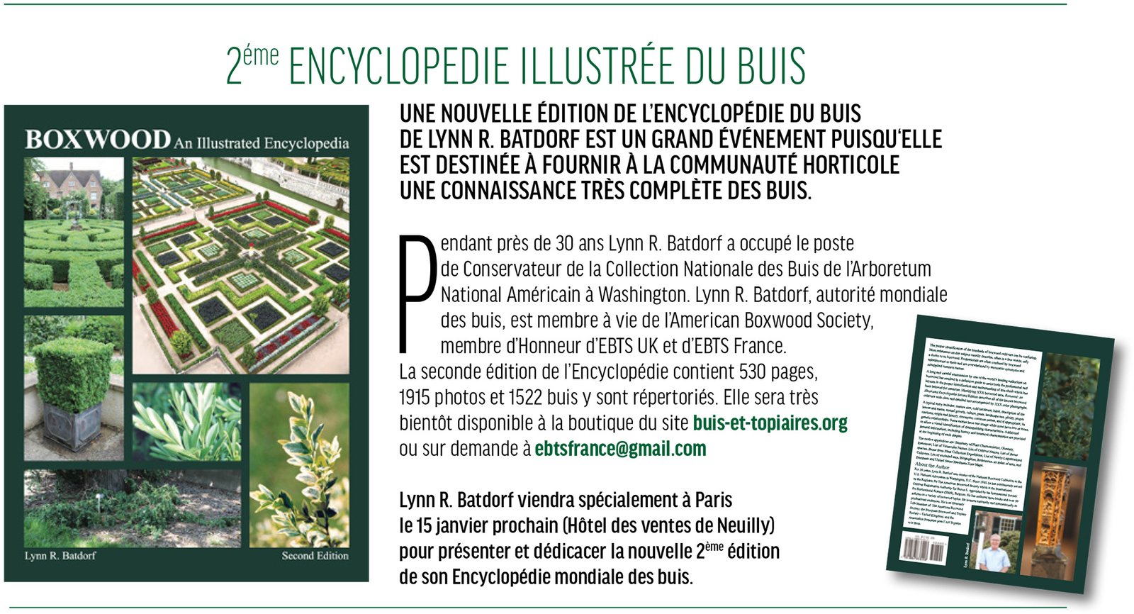 Lynn R. Batdorf viendra spécialement à Paris le 15 janvier prochain (salle des ventes de Neuilly) pour présenter et dédicacer la nouvelle 2ème édition de son Encyclopédie mondiale des buis.