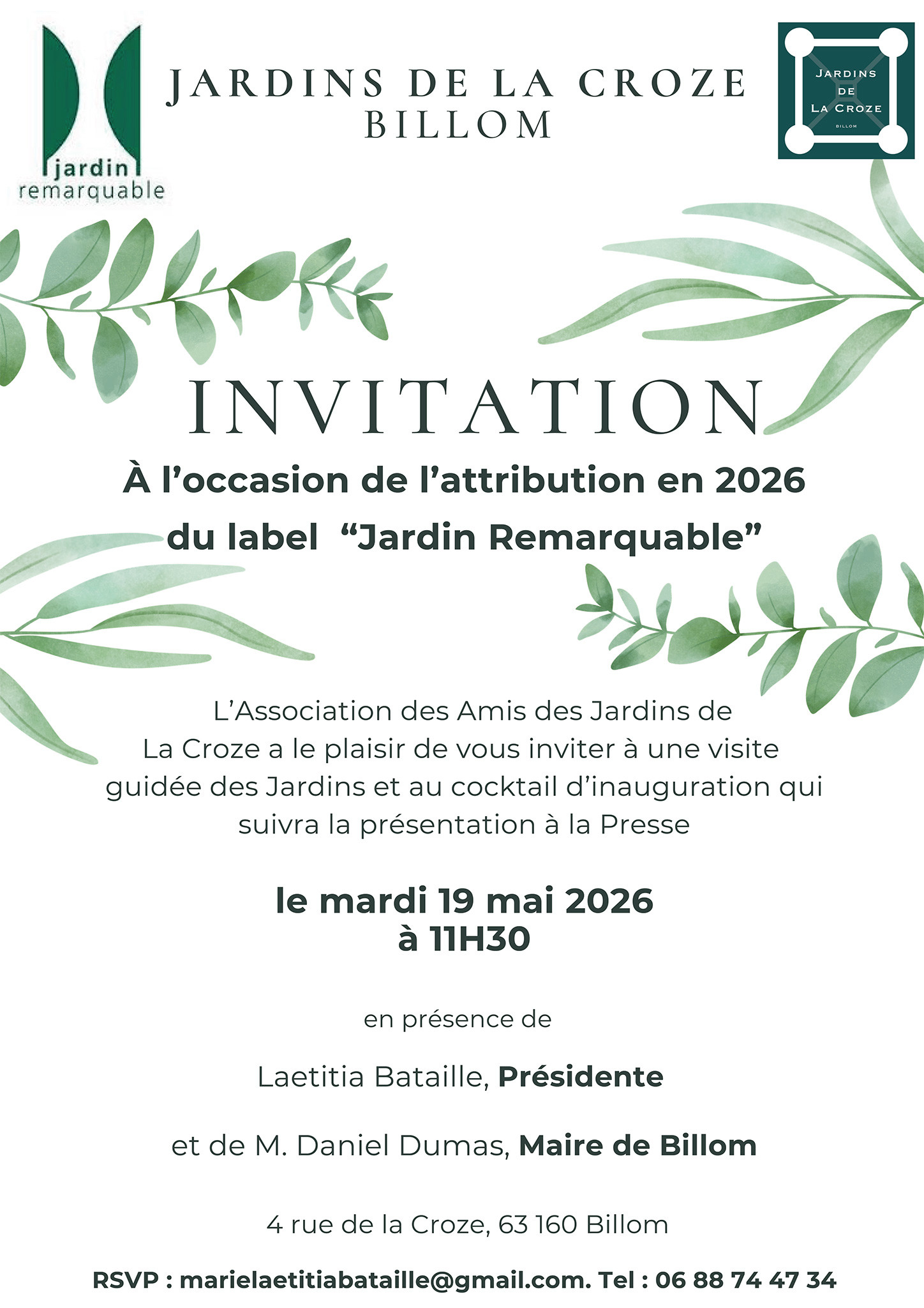L’Association des Amis des Jardins de La Croze a le plaisir de vous inviter à une visite guidée des Jardins et au cocktail d’inauguration qui suivra la présentation à la Presse.