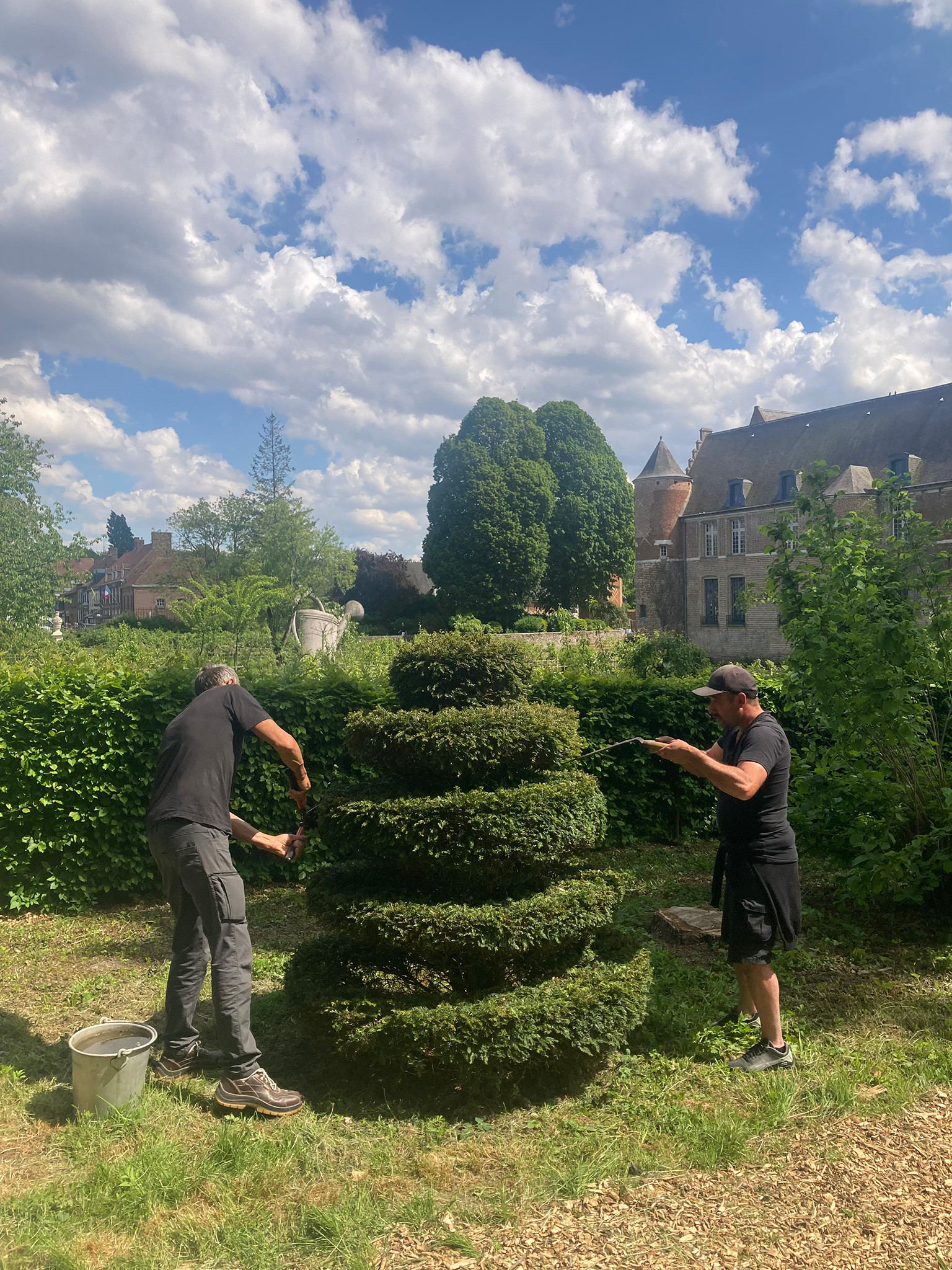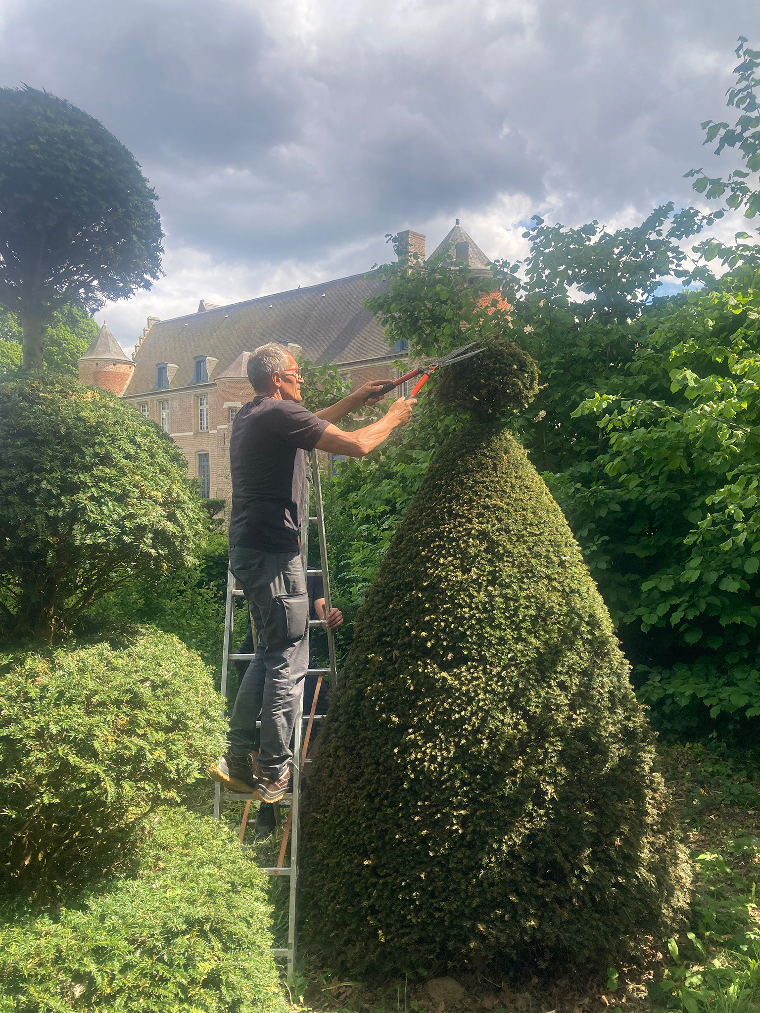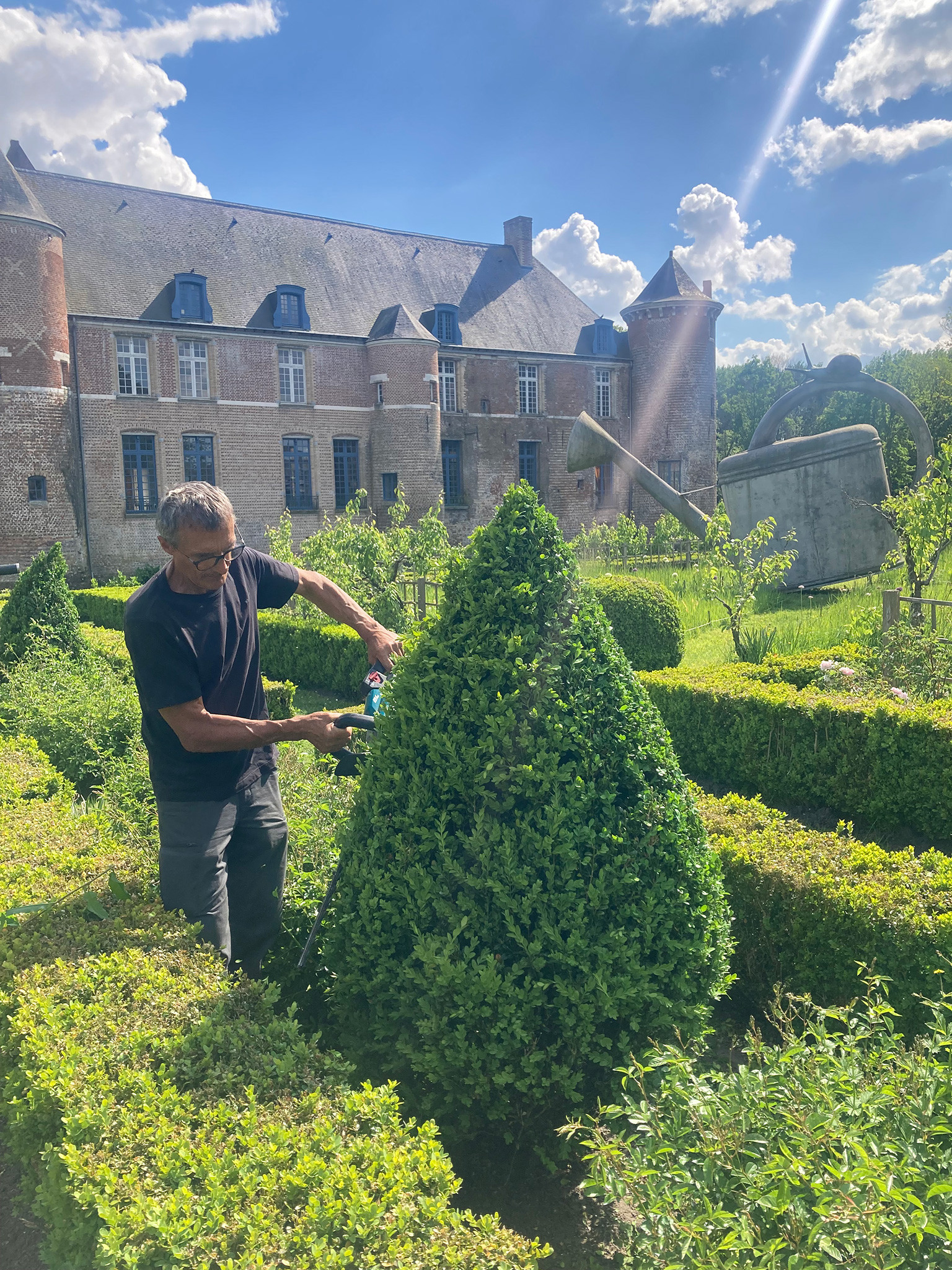 Chaque année, un kilomètre de buis est taillé et de nouveaux topiaires font leur apparition grâce à M. Becart, pépiniériste à St Jans Cappel.