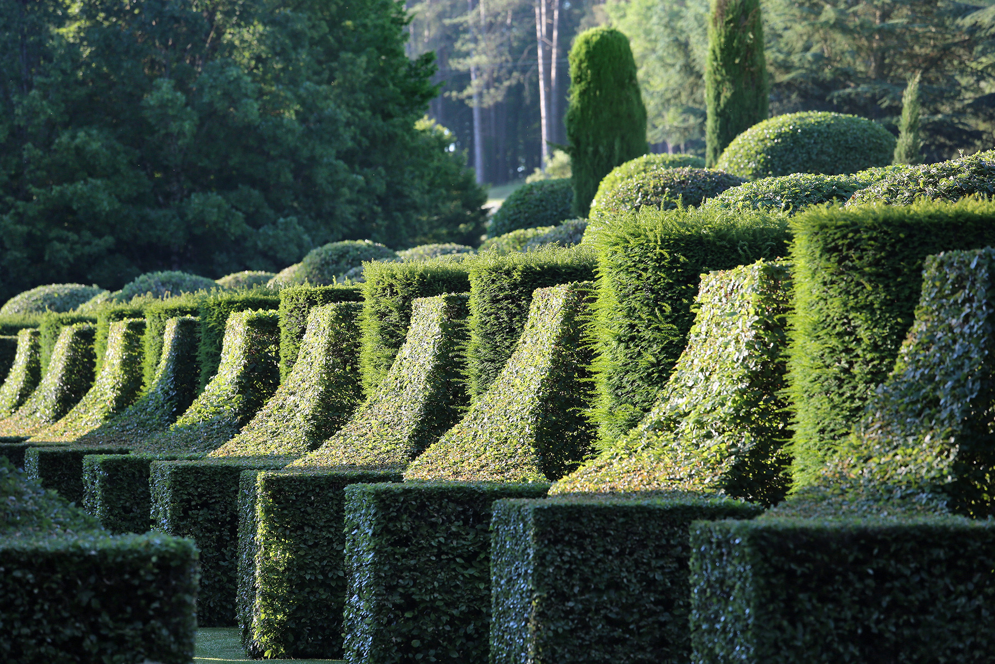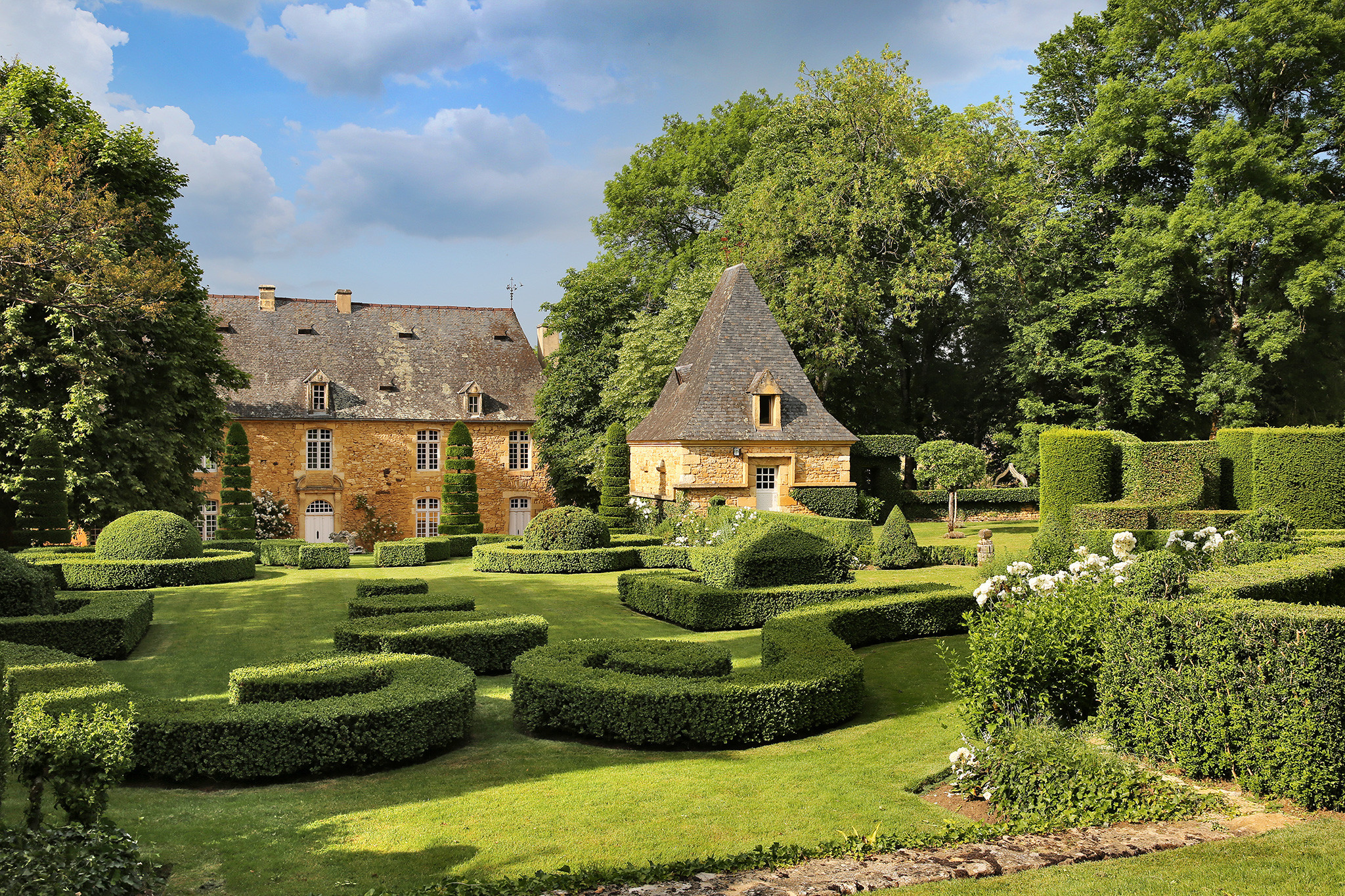 Autour du Manoir du XVIIe siècle s’étend le jardin français où les jeux de perspectives et la maîtrise de la Nature mettent en scène les arabesques de buis, les fontaines jaillissantes, les miroirs d’eau, les tapis de gazon et la collection de sculptures végétales taillées à la main par les jardiniers d’Eyrignac.